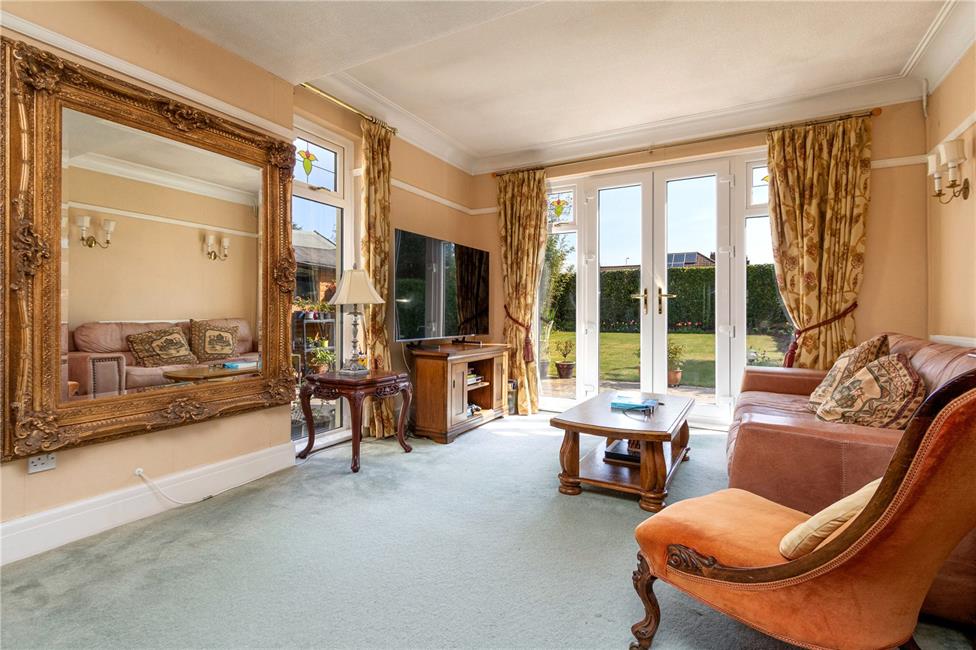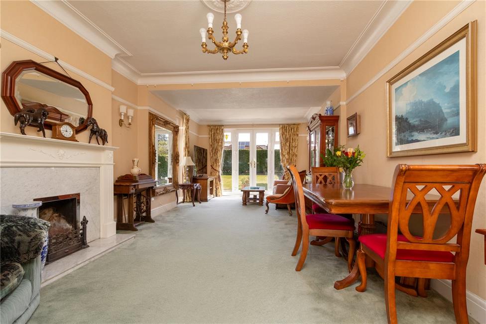 An extended and large principal room with stained and leaded windows to the side, full height windows and French doors leading onto the beautifully manicured and presented rear garden, feature fireplace with timber surround and cast iron grate on a marble style hearth, two radiators, TV point, period coved ceiling with picture rail and moulded skirting boards.