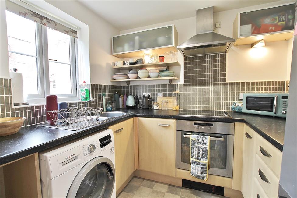 Appointed along three sides in wood grain finish fronts beneath round nosed worktop surfaces, inset 1.5 bowl stainless steel sink with side drainer, mixer tap, inset four ring hob with cooker hood above, integrated oven below, space for fridge/freezer, plumbing for washing machine, eye level storage with lighting below, wall tiling to worktop splashback areas, window overlooking communal gardens, vinyl flooring, low level 'Creda' heater.
