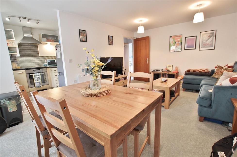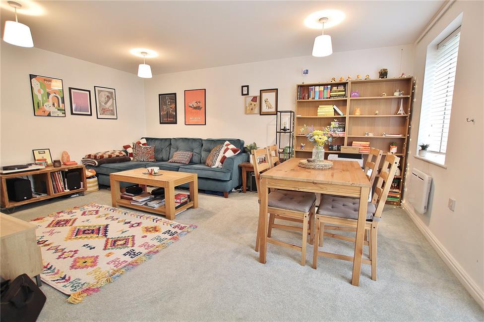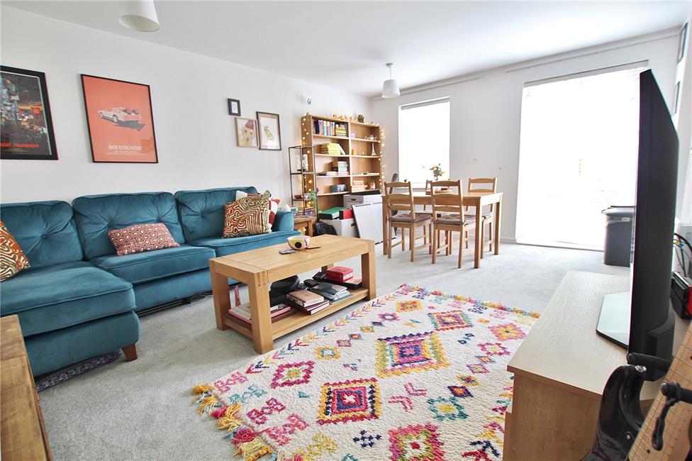 A good size reception room with aspect overlooking the communal gardens, French doors opening to a Juliette balcony enjoying a bright aspect, ample space for relaxation area and dining table, two 'Creda' electric heaters. Opening to . . .