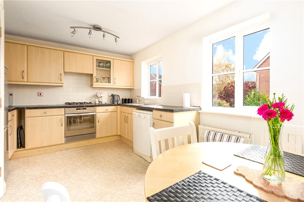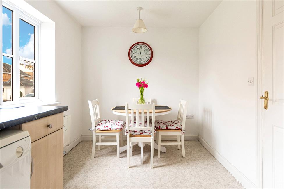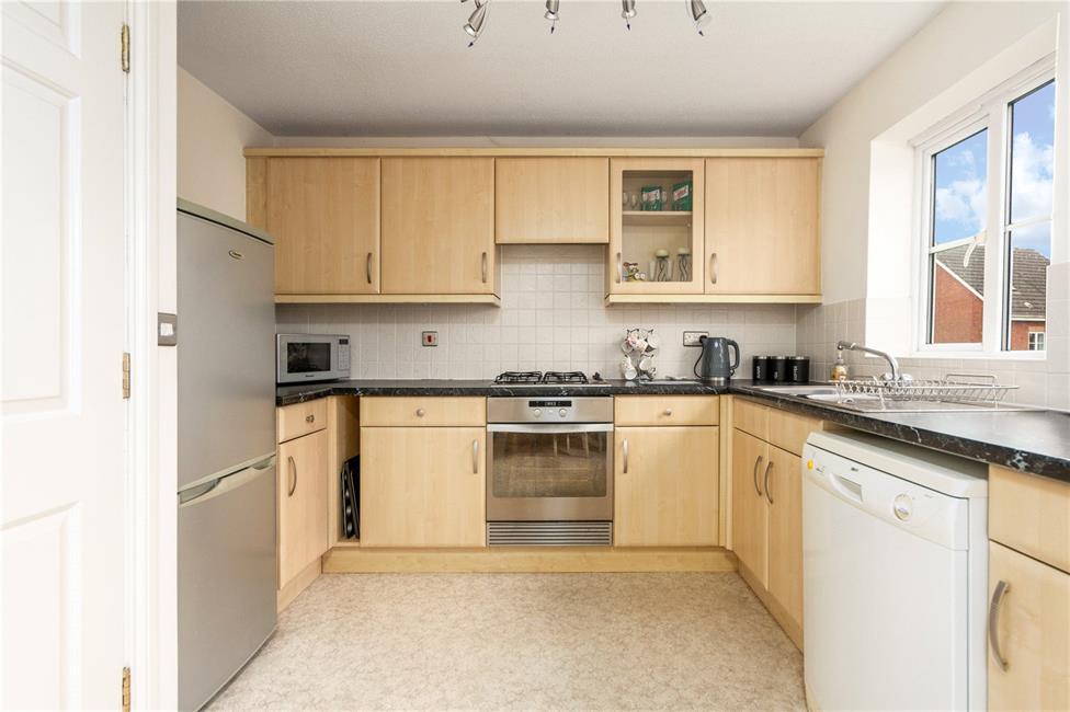 Appointed along three sides in light wood grain finish fronts beneath round nosed worktops surfaces, inset stainless steel 1.5 bowl sink and drainer with mixer tap, four ring gas hob with oven below and cooker hood above, space for upright fridge/freezer, space for dishwasher, matching range of eye level units with concealed lighting, ceramic wall tiling to worktops surrounds, two windows overlooking the rear garden, ample space for dining table, radiator, vinyl flooring.