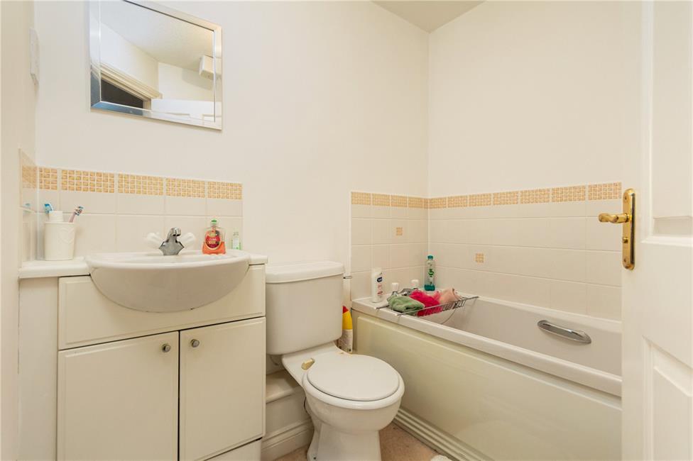 Comprising low level WC, wash hand basin with mixer tap and cabinet below, twin grip panelled bath, ceramic wall tiling to wet areas, radiator.