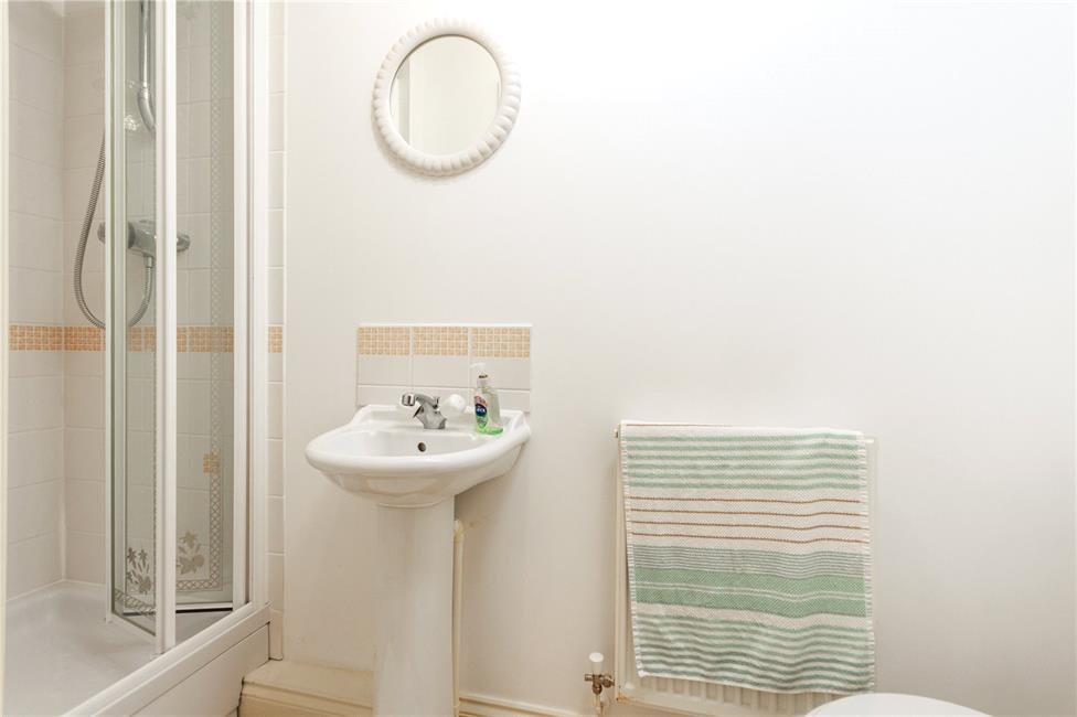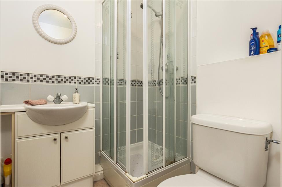 Comprising low level WC, wash hand basin with mixer tap and cabinet below, glazed shower cubicle with thermostatic shower, ceramic wall tiling to wet areas, radiator.
