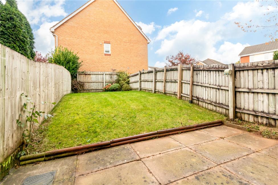Paved patio area leading onto a large section of lawn with established shrubs to the rear, enclosed with timber lapped fencing.