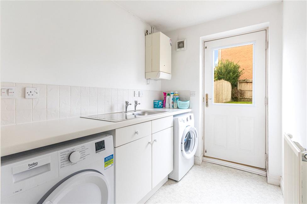 Glazed door to rear patio, range of base units beneath a round nosed worktop surface with inset stainless steel sink and drainer, space and plumbing for automatic washing machine and condensing dryer, wall mounted ideal classic gas central heating boiler, radiator, vinyl flooring.