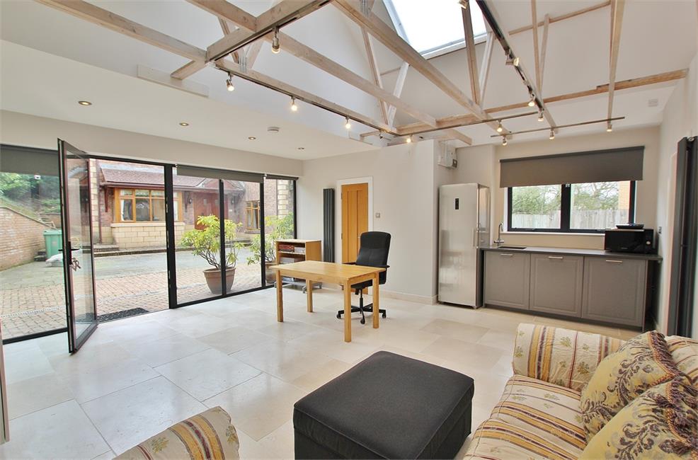 Ideal as a home office or gym, dependent on needs. Double glazed doors and side screens overlooking the entrance area, limestone tiled flooring with matching skirting boards, tall vaulted ceilings with monitors, electric heating, kitchenette area with inset sink, mixer tap, space for upright fridge/freezer, double glazed window to side.