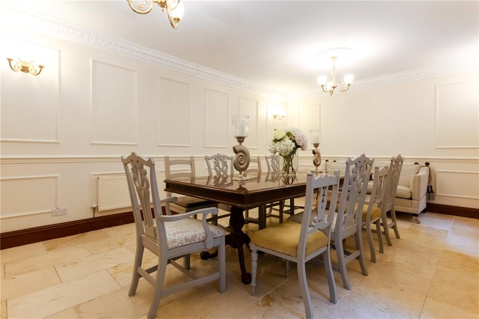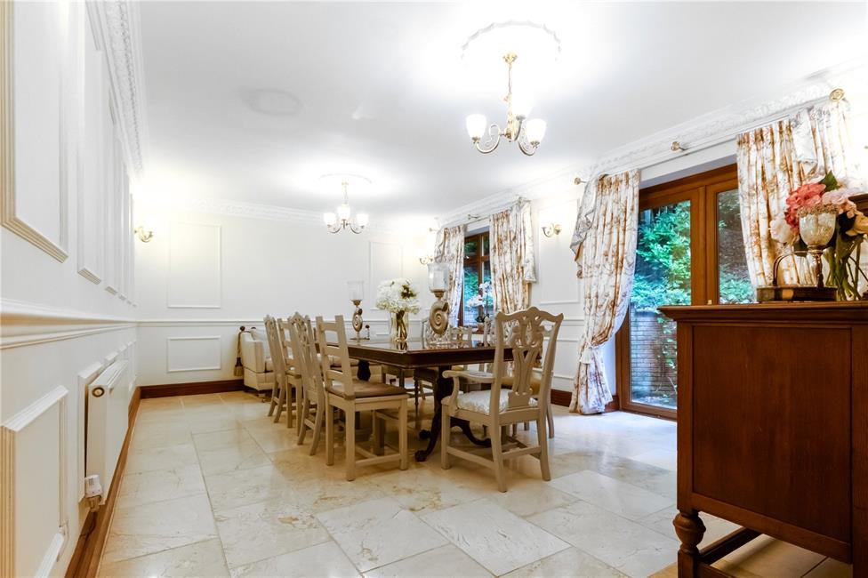Spacious elegant dining room, double glazed French doors leading to the rear patio, attractive wall panelling with dado rail, cornice ceiling, marble tiled flooring, two radiators.