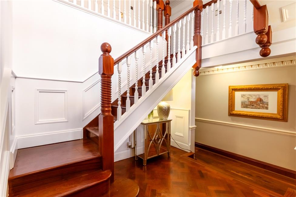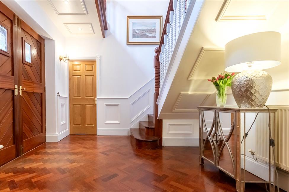 Twin panelled doors leading onto a welcoming central hallway with newel posts and rope carved spindles, visible galleried landing, woodblock flooring, radiator. Deep inner hallway, radiator.