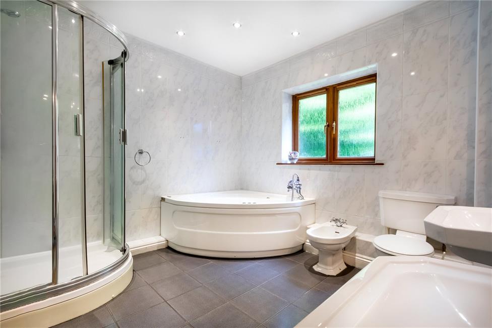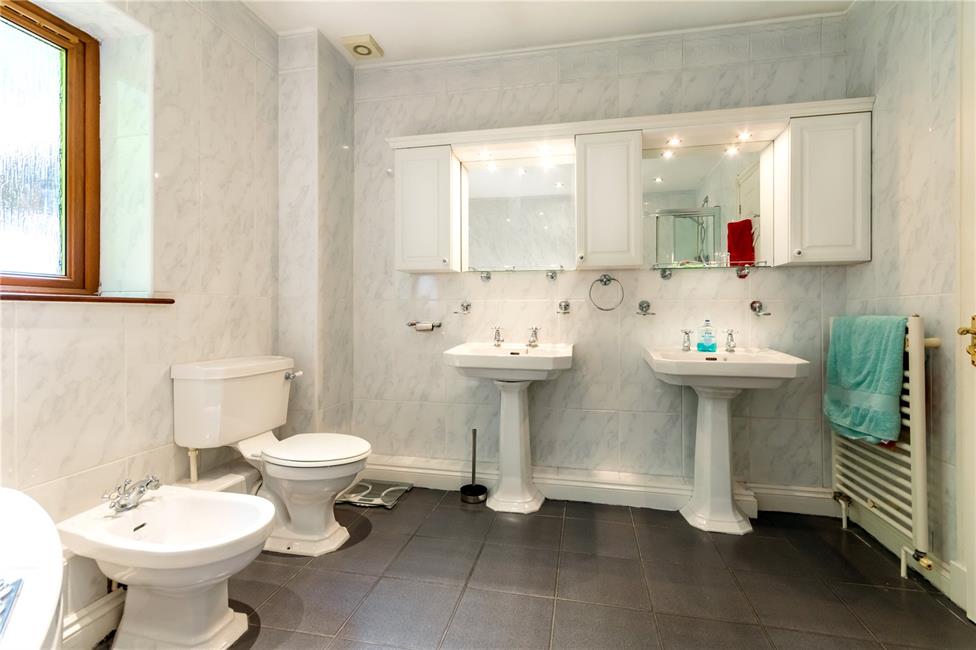 Spacious 6-piece suite comprising his'n'hers pedestal wash hand basins by Chatsworth, low level WC, bidet, shaped corner bath with jets, large corner shower cubicle, glazed shower screen panels, ceramic wall tiling, tiled flooring, heated towel rail.