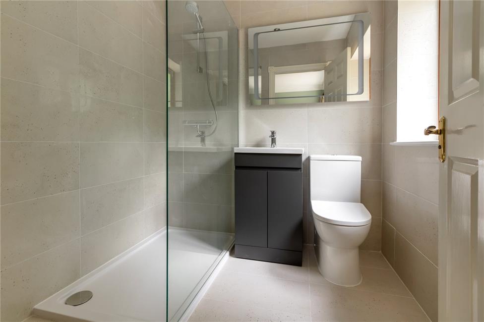 Recently installed quality suite comprising low level WC, wall-mounted wash hand basin with mixer tap and wall mirror with LED lighting, large semi-enclosed shower cubicle, quality wall and floor tiling, inset spotlights.