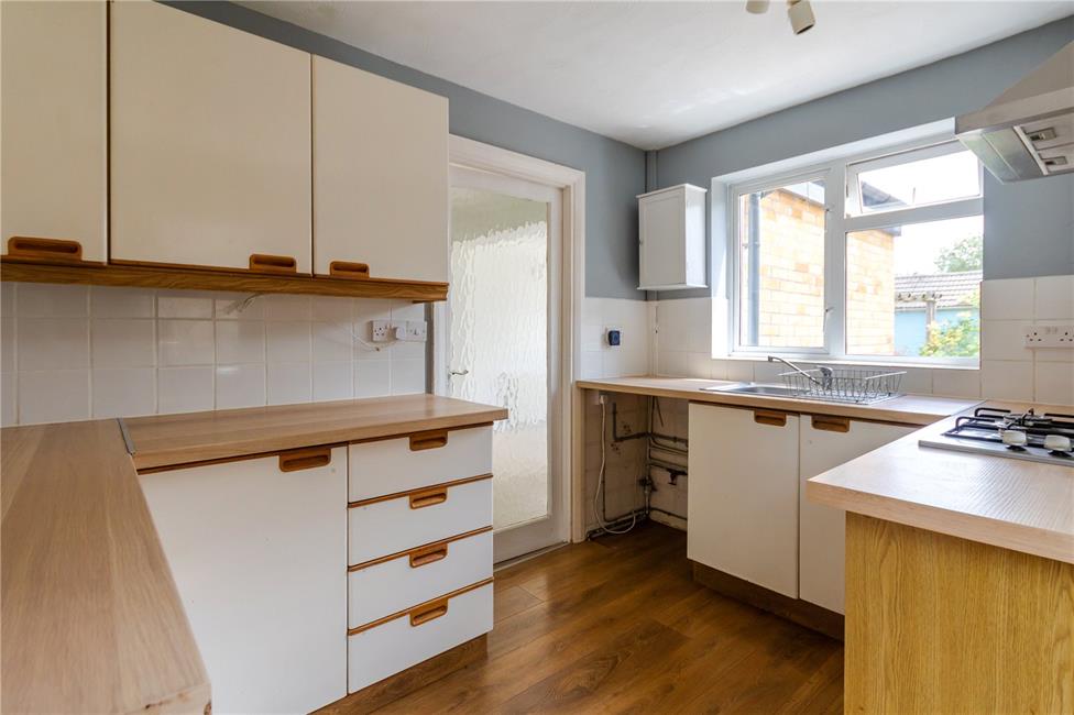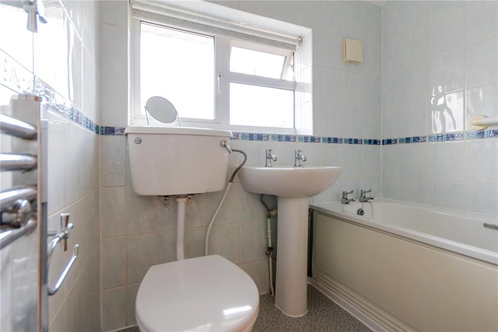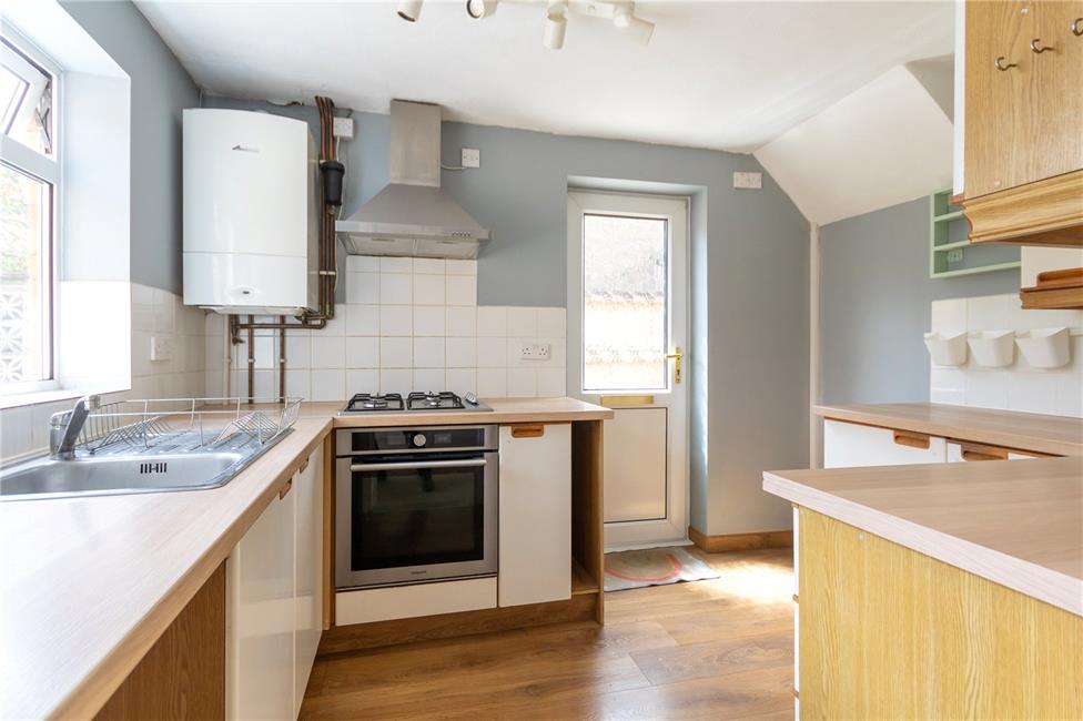 Overlooking the rear garden, appointed along four sides comprising of eye level units and base units with drawers and round nosed worktops over, inset stainless steel sink with mixer tap and drainer, ceramic tiling to work surface surrounds, four burner gas hob with electric oven below and cooker hood above, space for upright fridge/freezer, plumbing and space for washing machine, wall mounted Worcester gas central heating boiler.