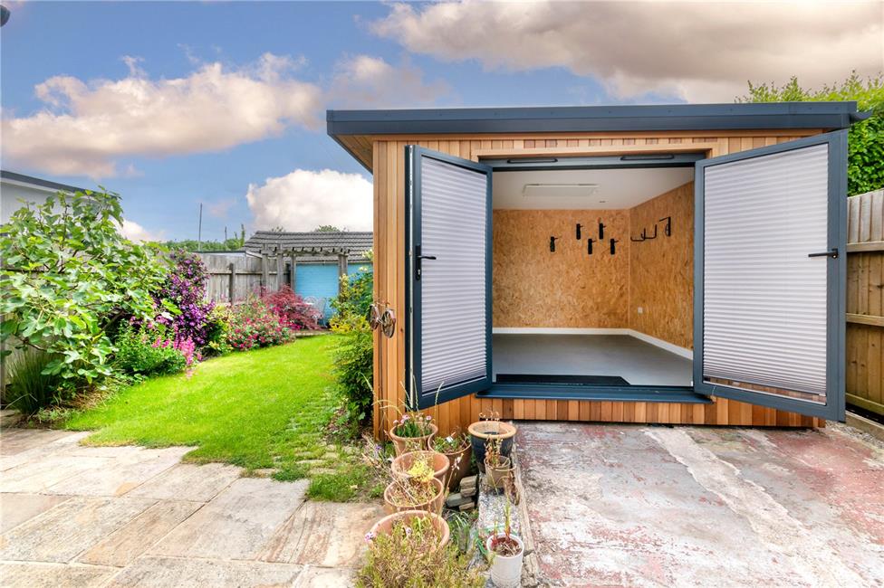 Partially enclosed to the front with a driveway (parking for at least 4 cars), beautifully manicured rear garden with a recently constructed bespoke detached cedar cladded garden room and attached workshop.
