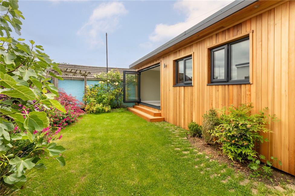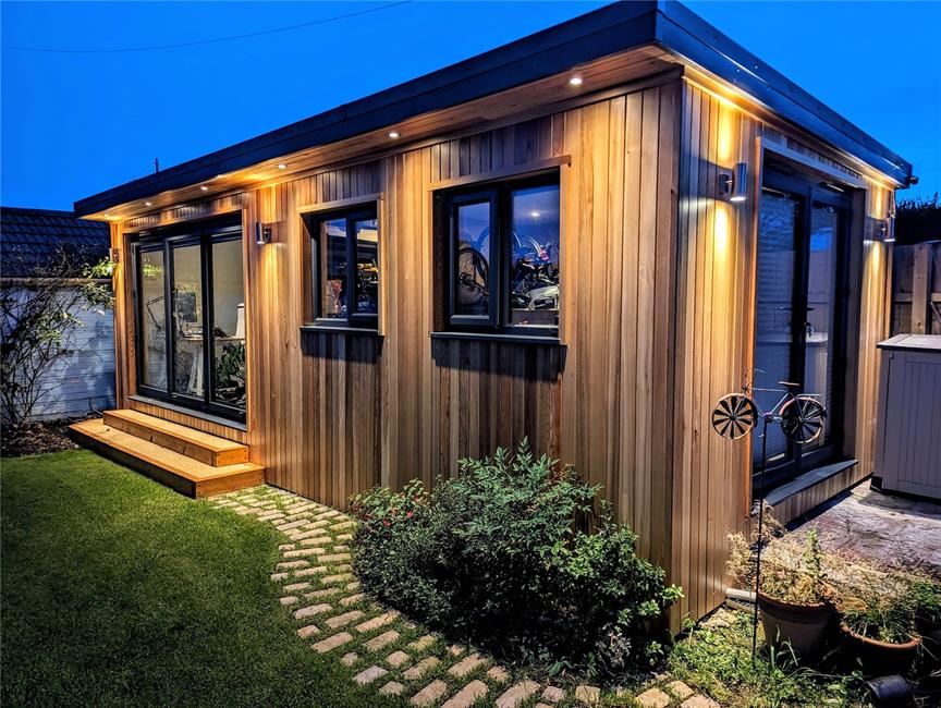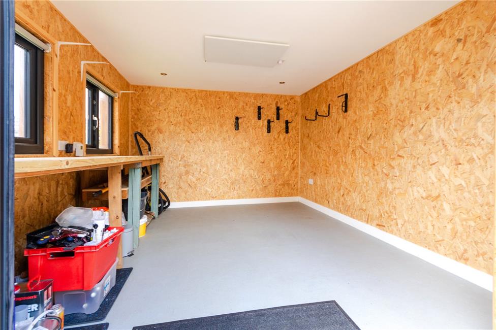 Recently constructed bespoke detached garden room with cedar cladded exterior and ambient lighting. Garden Room 11'6 (3.5m) x 10'1 (3.07m) with fully retractable tri-fold doors, quality herringbone style wood effect flooring, electric points, infared ceiling panel heater. Workshop 11'6 (3.5m) x 10'1 (3.07m) with workbench, power points, non-slip floor covering, plumbing and space for washing machine.