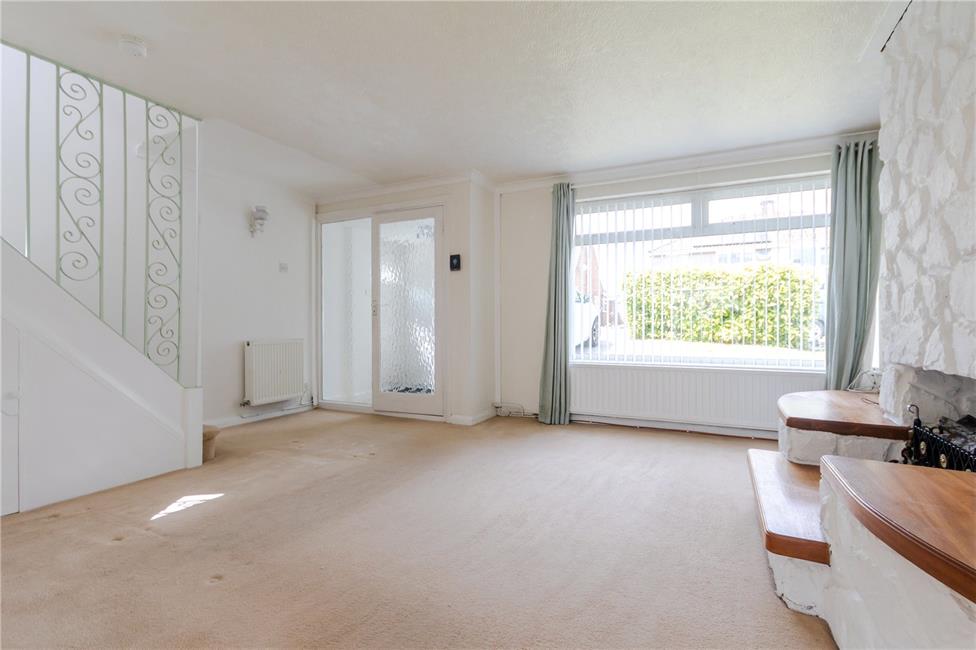 Large window overlooking the front garden, mock painted stone chimney breast with a large wooden top and split level hearth, two radiators, easy rising staircase to the first floor landing with wrought iron balustrade, under stairs storage cupboard, coved ceiling, square opening leading to the dining room area.