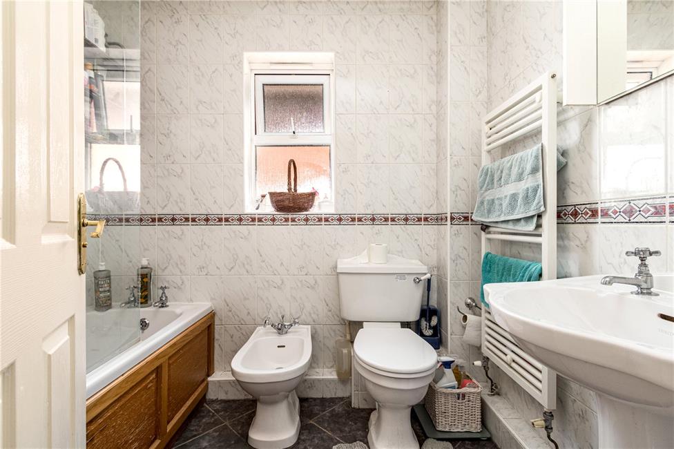 Opaque window to side, modern white suite comprising of a panelled bath with electric shower over, close coupled WC, pedestal wash hand basin, separate bidet, comprehensive ceramic floor and wall tiling, heated towel rail.