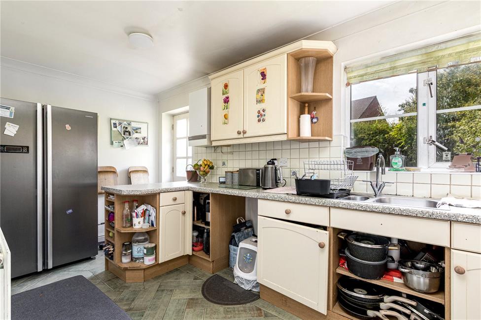 Overlooking the rear garden, cream fitted kitchen appointed along three sides comprising of eye level units and base units with drawers and round nosed worktops over, ceramic wall tiling to work surface surrounds, fitted four burner gas hob, inset 1.5 bowl sink with mixer tap and drainer, fitted eye level oven and separate grill, panelled radiator, wall mounted gas central heating boiler, double glazed door giving access to the rear garden, door into utility room.
