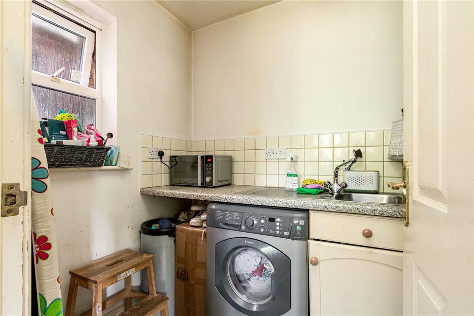 Opaque window to side, additional base unit appointed along two sides comprising of drawers, matching worktop over and ceramic wall tiling surrounds, inset sink with mixer tap and drainer, continuation of the quality herringbone style flooring, radiator, plumbing and space for washing machine, space for tumble drier.