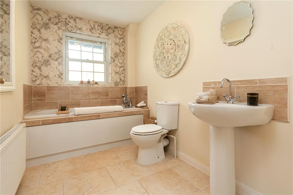 Spacious modern suite comprising pedestal wash hand basin, low level WC, panelled bath with shower mixer, ceramic tiling to wet areas, tiled flooring, radiator.