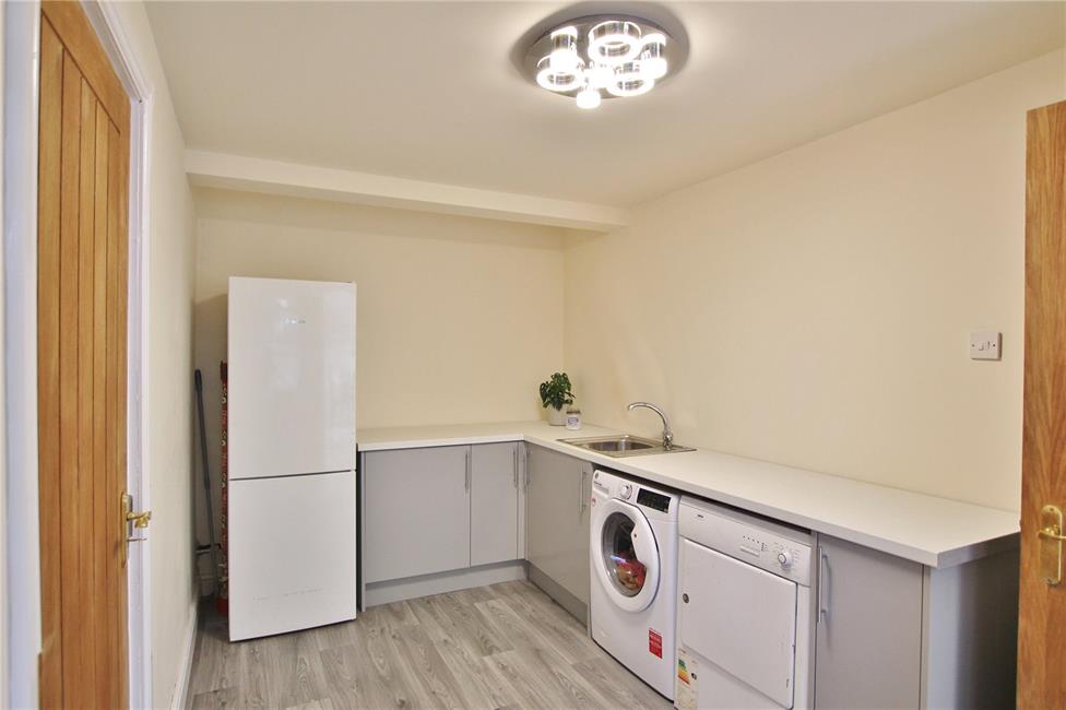 Range of base cupboards beneath lipped worktop surfaces, inset sink and drainer with mixer tap, plumbed for automatic washing machine, connecting door to integral garage.