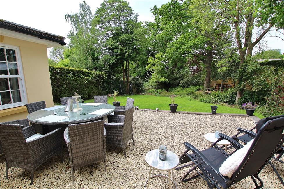 Large patio area with timber deck barbecue relaxation area with balustrade and steps leading to an area of lawn. Additional raised timber deck platform overlooking the meandering stream and bridge leading to an additional area with mature oak trees (with tree Preservation Orders) and vegetation, enjoying a sunny aspect. Outside lighting.