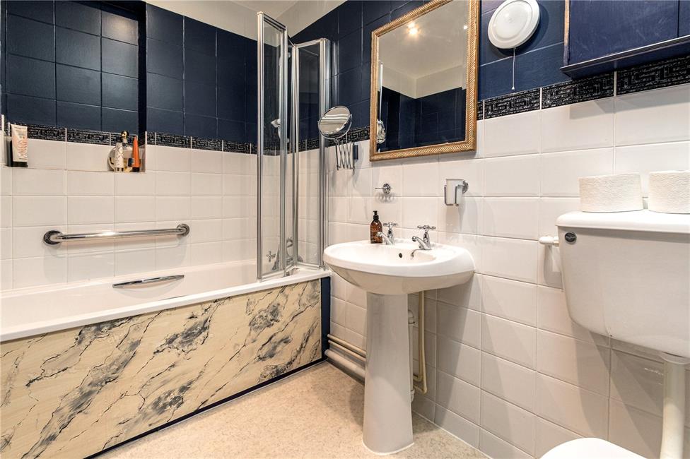 Low level WC, pedestal wash hand basin, twin gripped panelled bath with shower screen and telephone style shower mixer tap, heated towel rail, comprehensively tiled walls, vinyl flooring.