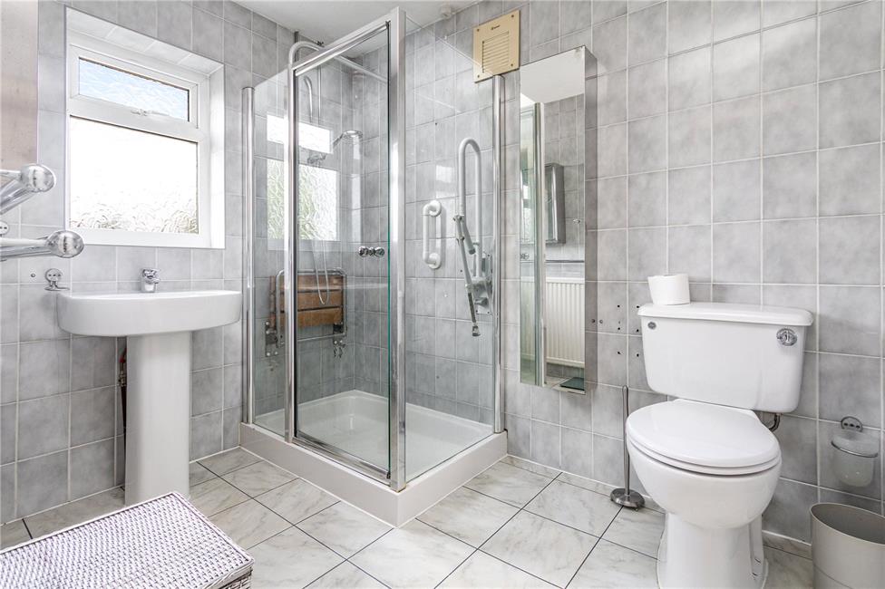 Low level WC, pedestal wash hand basin with mixer tap, shower cubicle with thermostatic shower, comprehensively tiled walls and flooring, opaque window to rear, radiator.