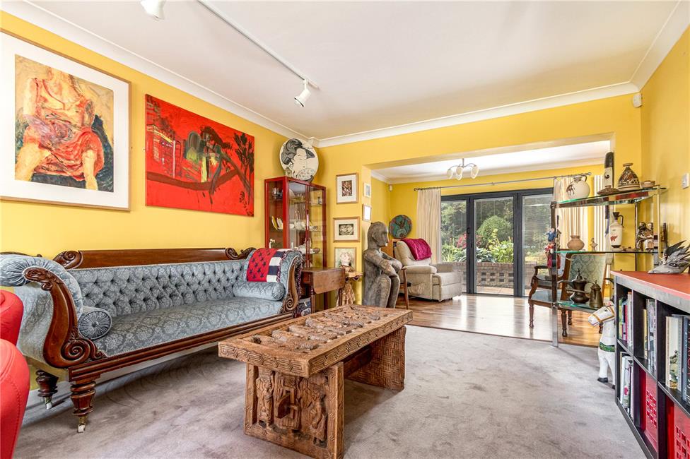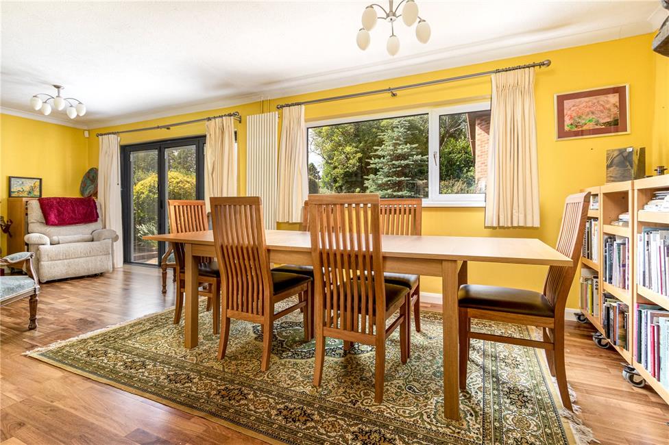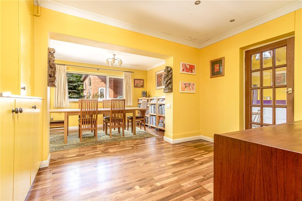 Window and anthracite grey bi-folding doors with integrated blinds leading out onto the delightful lawned rear garden, ample space for large family dining table, modern upright radiator, wood grain effect laminate flooring, coved ceiling, range of fitted cabinets, inset spotlights.