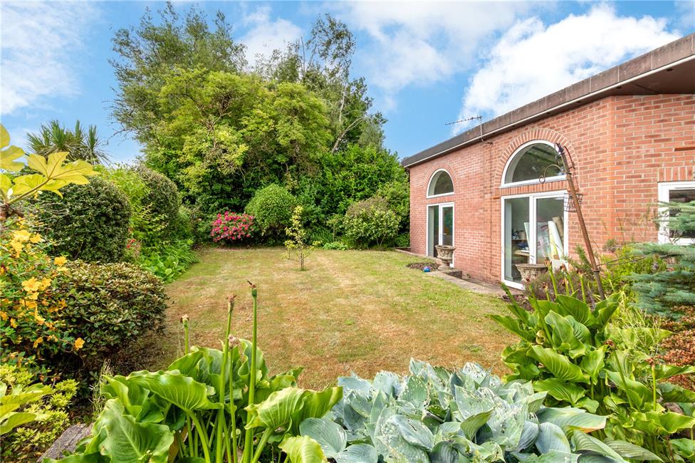 Landscaped rear garden with paved patio area, stepping up to a large section of lawn with well established borders well stocked with a variety of shrubs, trees and plants, sheltered pathway leading from the kitchen to the studio, cold water tap, security lighting, large timber garden shed with doors to the front and rear which accesses the side area, with iron gate leading to the front driveway.