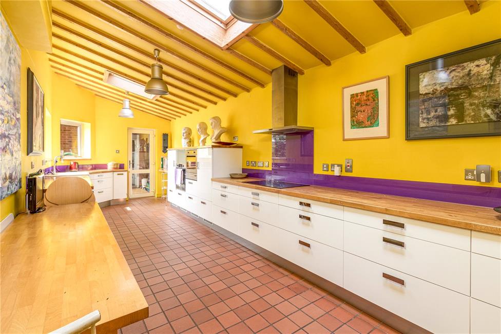 Appointed along two sides in white gloss finish fronts with chrome handles beneath wooden worktop surfaces, inset double Belfast sink with swan neck mixer tap, wide four ring induction hob with stainless steel cooker hood, integrated oven, microwave and warming draw, space and plumbing for dishwasher, tall vaulted ceiling with three Velux roof lights, quarry tiled flooring, radiator, door to garage, two windows to side and glazed uPVC door leading to the rear garden and studio.