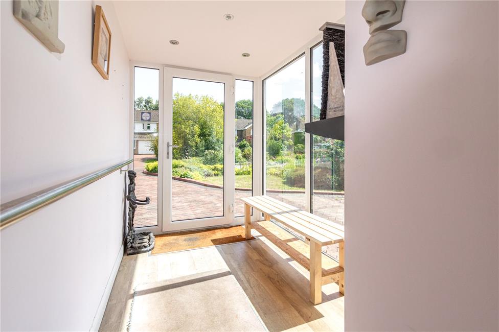 Approached via a uPVC framed glazed door with full height matching windows to side, quality woodgrain effect flooring, inset spotlights, handrail.