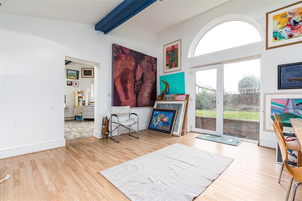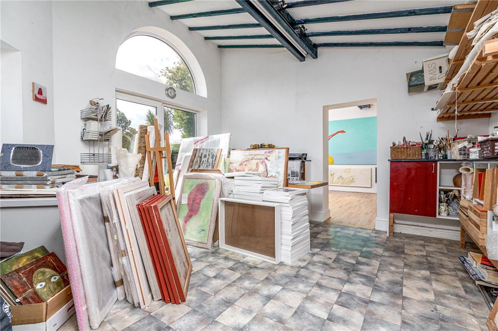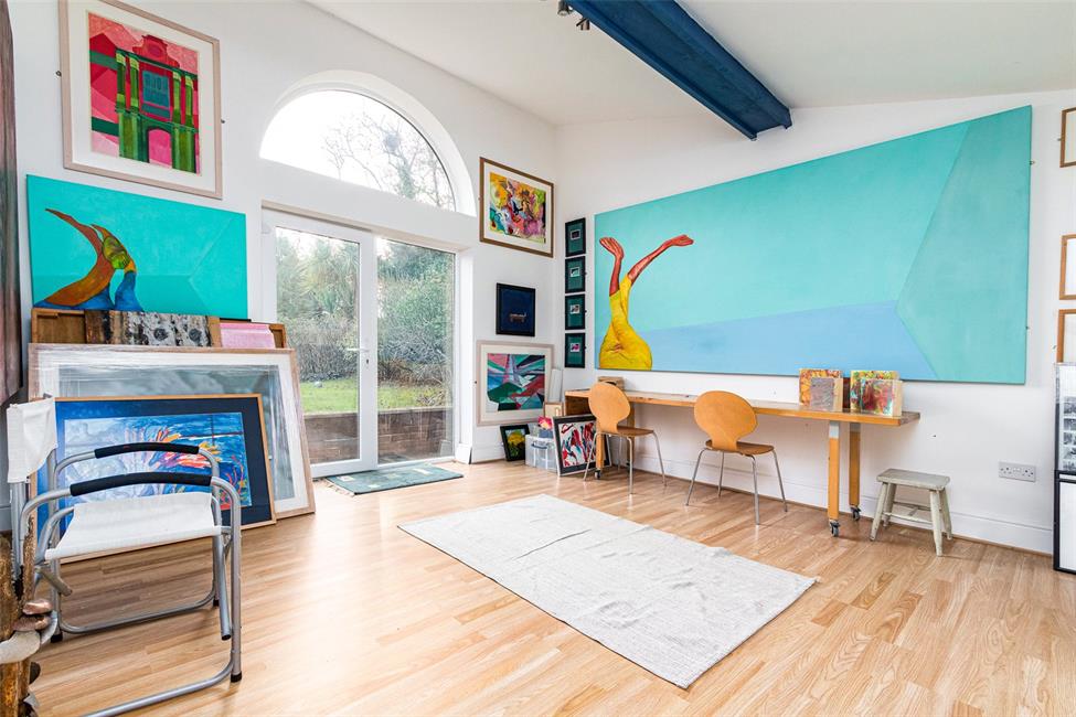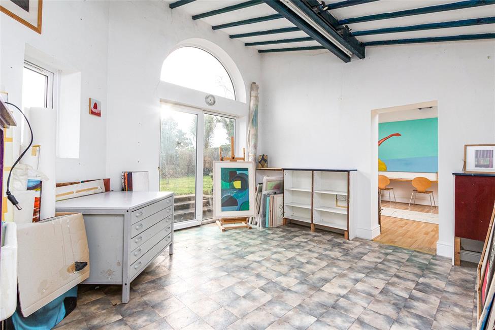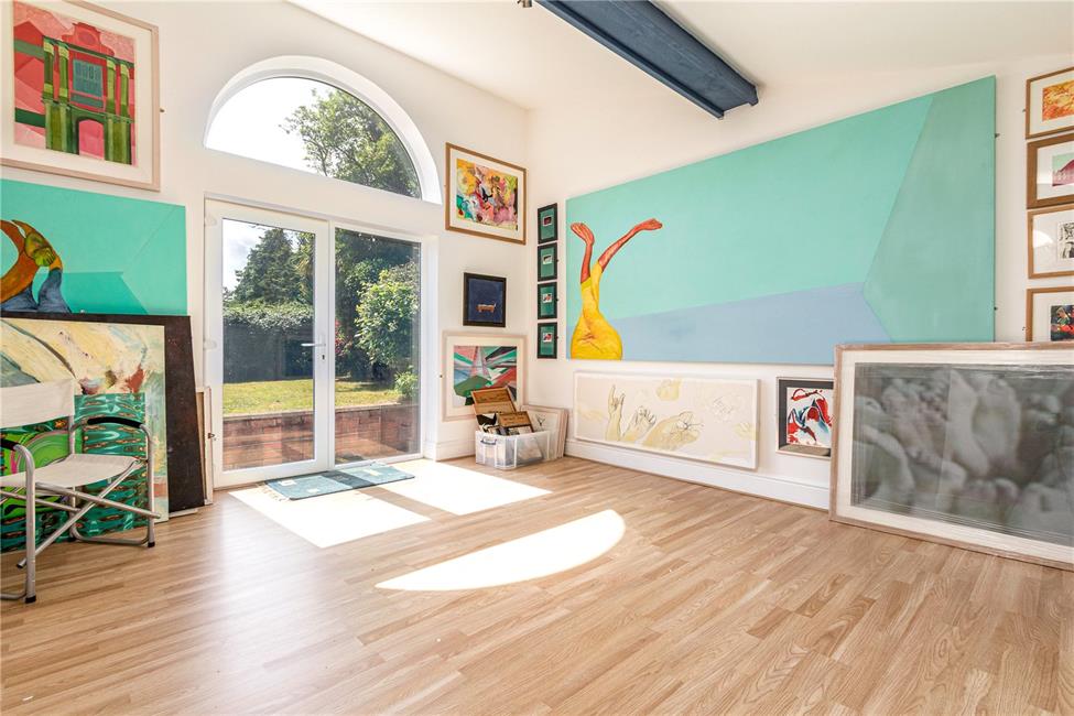 uPVC double glazing, gas central heating. Wide landscaped lawned front garden with keyblock driveway, delightful mature lawned rear garden with patio area. impressive artist studio set to the rear, divided into two spacious rooms with patio doors and feature arched windows with vaulted ceilings. Large integral garage with electric door.