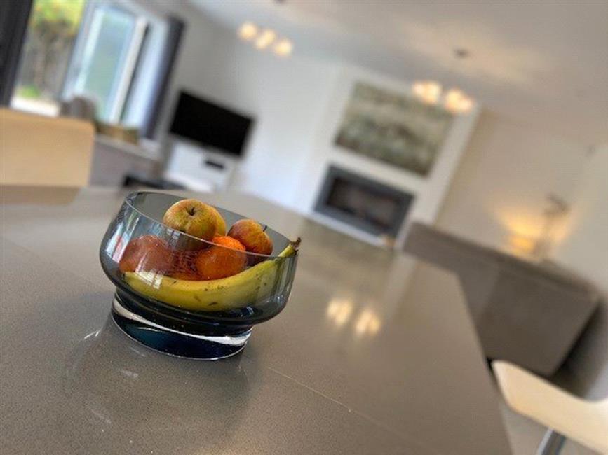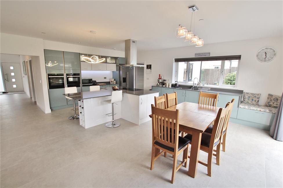 Of generous proportions and impressive, two sets of bi-folding doors leading onto the ornamental garden, feature log burning fire by Gazo, luxury range of fitted units along two sides with LED under lighting, feature glass display cabinets, integrated Neff oven with heated tray below, integrated Neff oven, range of base and eye level wall cupboards, quartz granite worktop surfaces, inset twin stainless steel sinks with mixer tap, feature central island with Neff induction fan hood above, wealth of base store cupboards, quartz granite breakfasting island with wine rack store, American style Samsung fridge/freezer, ample pace for dining table.