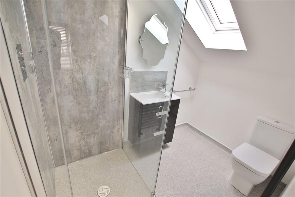 Low level WC, vanity wash basin by Roca, cabinet below, large shower cubicle with glazed shower screens and shower head, heated towel rail.