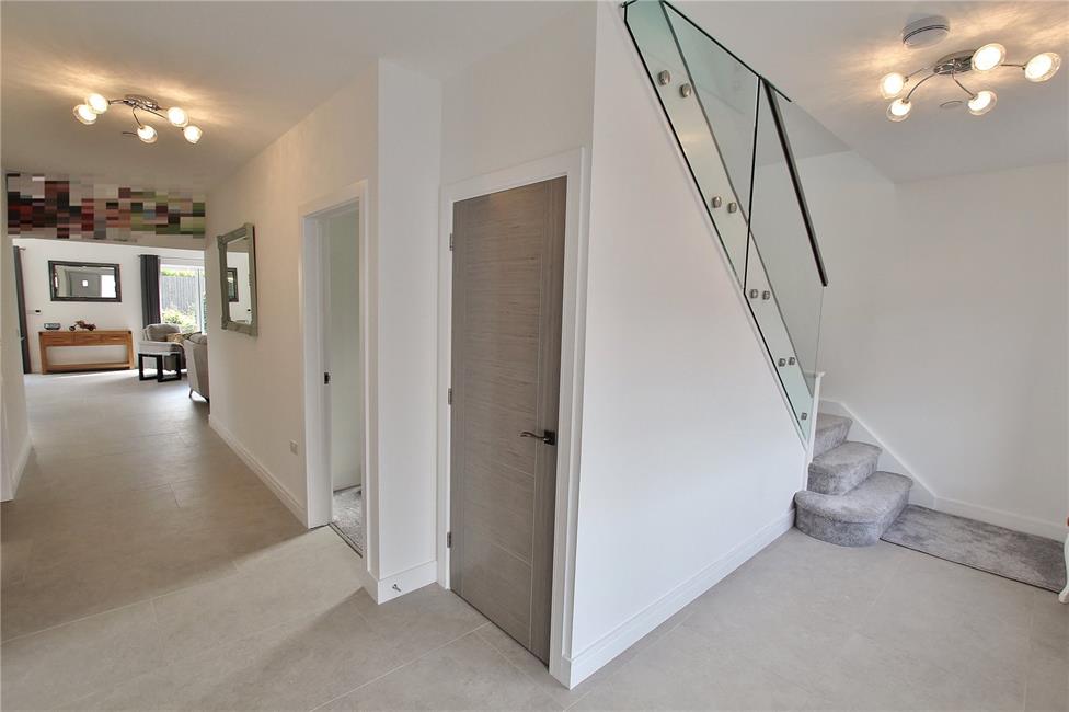 Approached by a secure composite front door with double glazed inserts, matching floor to ceiling side panel, leading onto a welcoming hallway with lobby and bay to front overlooking the entrance approach, single flight staircase to first floor level, deep storage cupboard under stairs recess, quality tiled flooring.