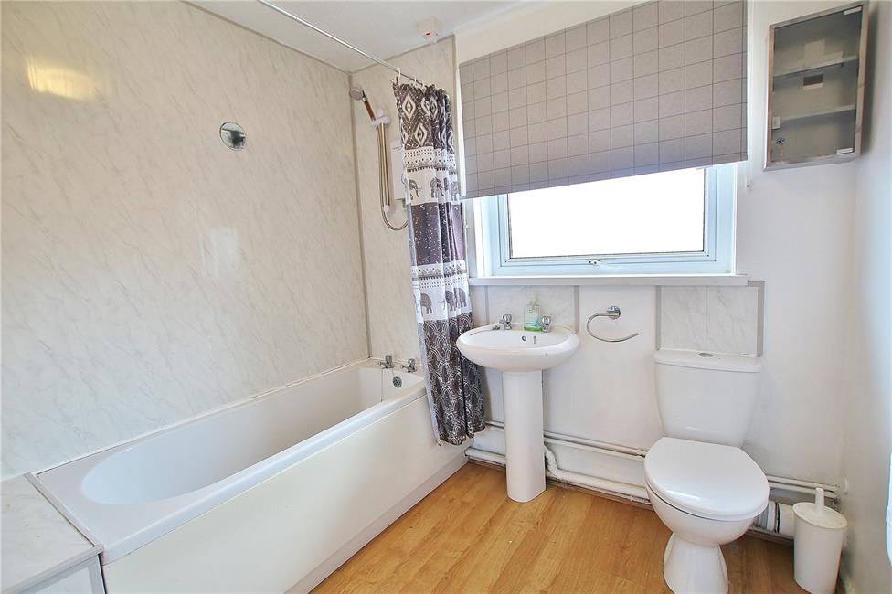 Opaque window to the front, a white suite comprising of a panelled bath with electric shower over, pedestal wash hand basin, close coupled push-button WC, laminate flooring, double radiator.