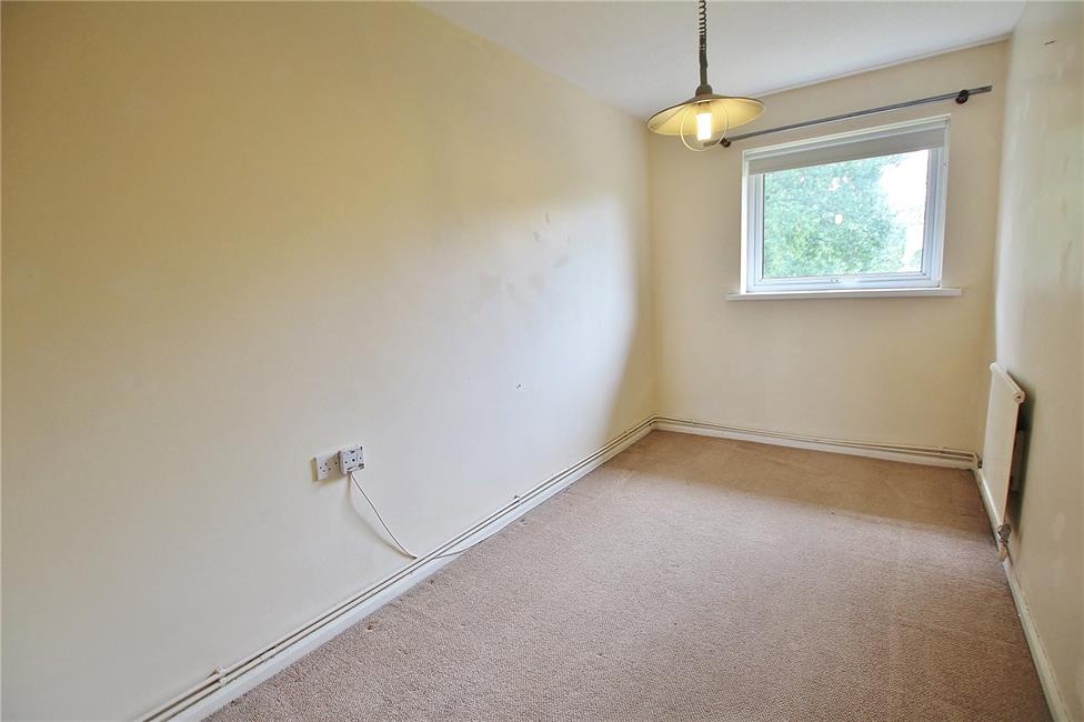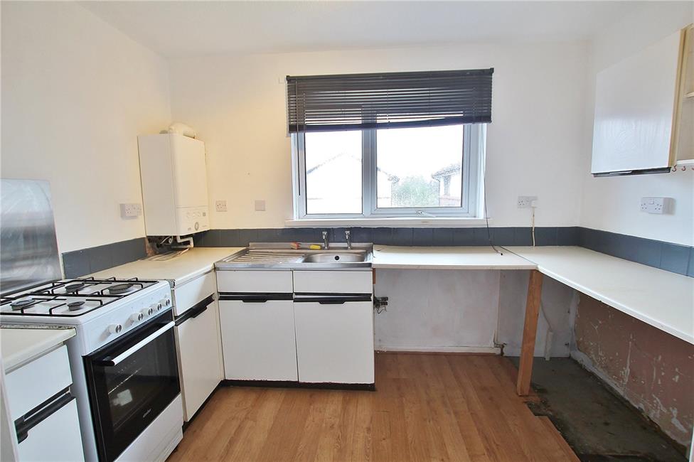 Overlooking the front parking spaces at end of cul-de-sac. Basic kitchen units appointed along three sides with eye level unit and base units with drawers and worktops over, inset sink with drainer, space for cooker, plumbing and space for washing machine or dishwasher, further spaces for low level fridge and freezer, wall mounted combination gas central heating boiler.
