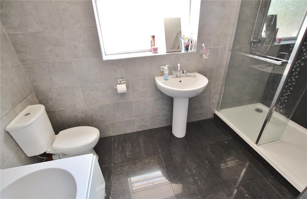 Spacious bathroom, modern suite comprising low level WC, pedestal wash hand basin, panelled bath with shower attachment, glazed shower screen panels, large double width walk-in shower cubicle with glazed shower screen panels and Mira shower, attractive ceramic wall tiling, chrome heated towel rail, tiled flooring.