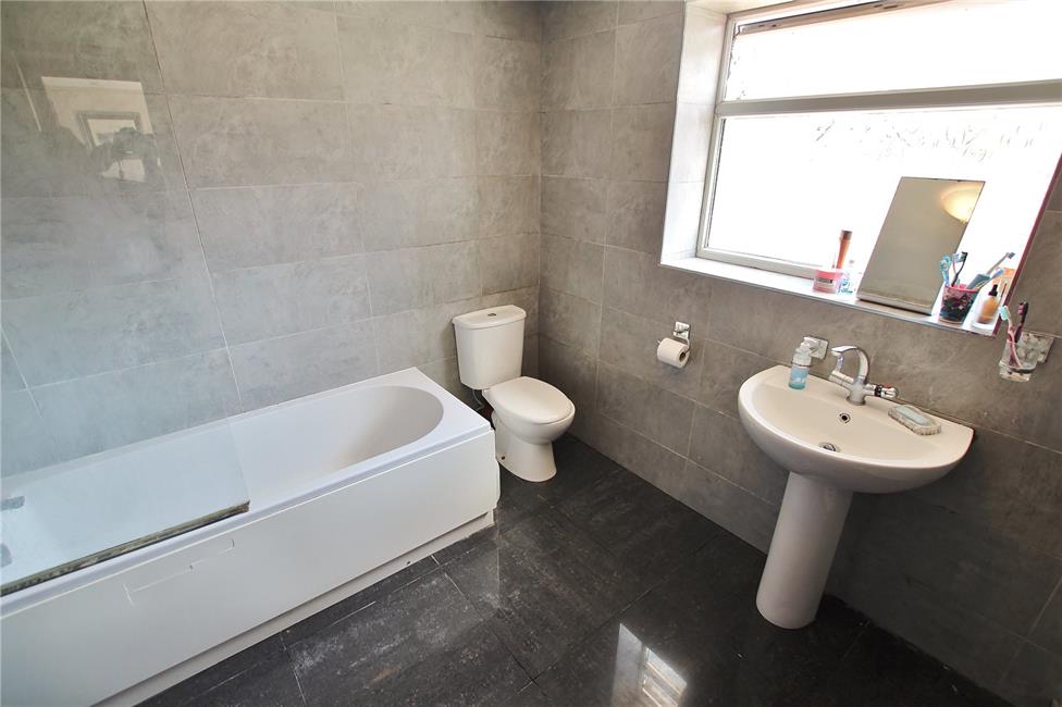 Low level WC, pedestal wash hand basin, chrome heated towel rail, ceramic floor and wall tiling, window to side.