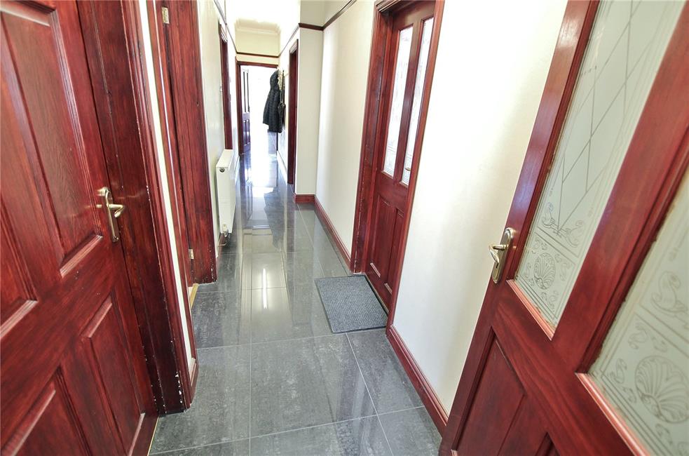Approached by a panelled front door with glazed inserts to upper part, leading onto a central hallway, quality tiled flooring, radiator, tall corniced ceiling, access to roof space.