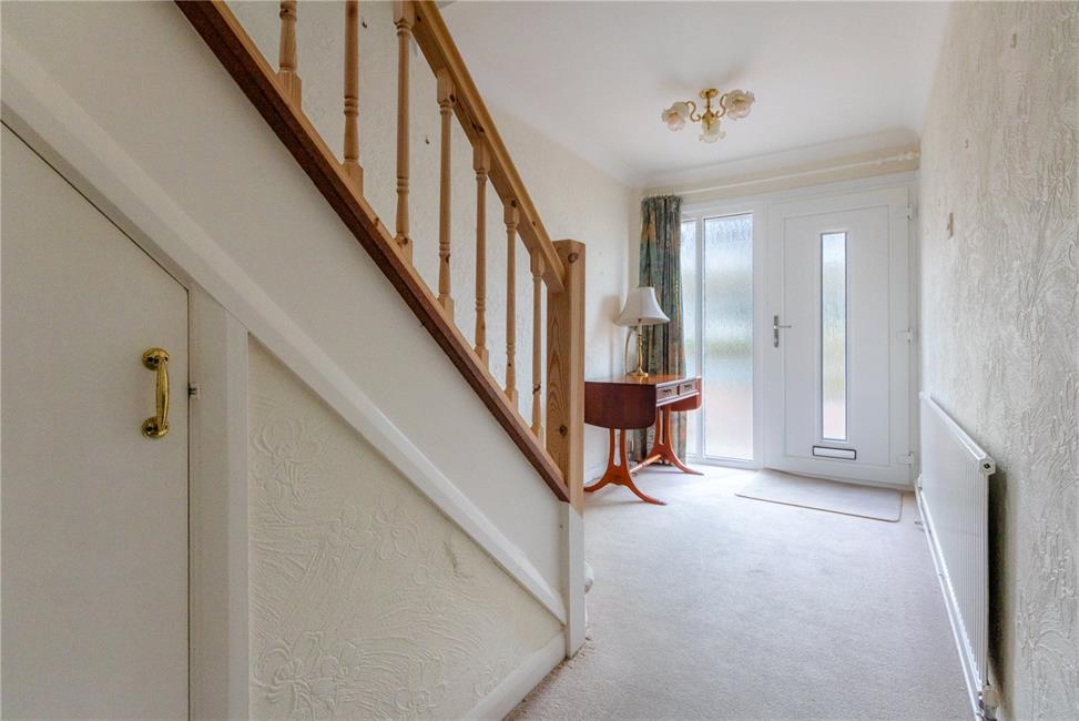 Approached by a uPVC glazed entrance door with matching glazed side panel, leading onto a large welcoming central hallway, radiator, half turning spindle staircase to first floor landing, coved ceiling.