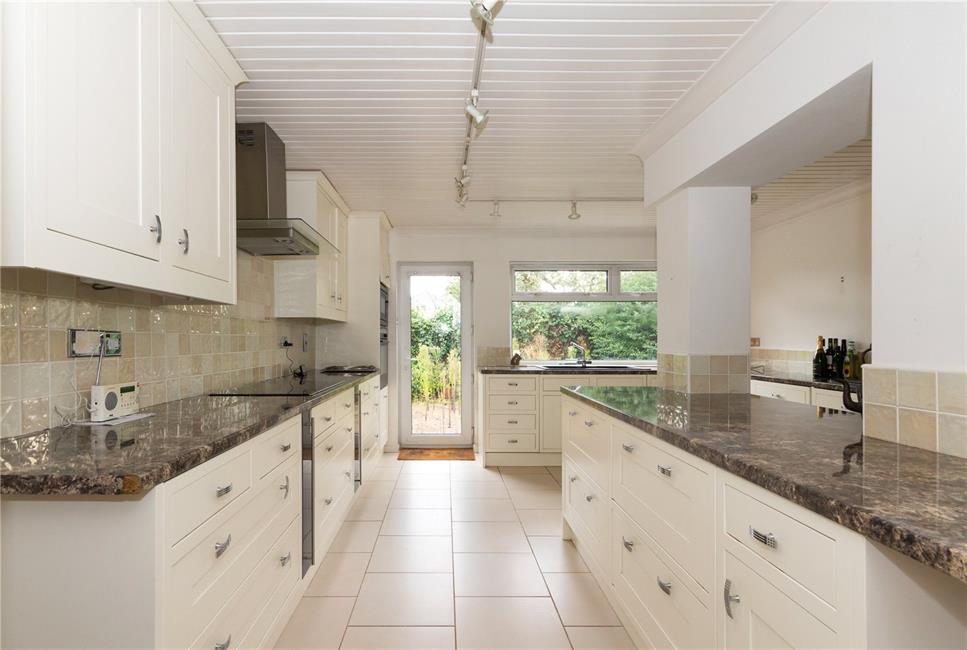 Appointed along three sides in light wood grain finish fronts beneath round nosed worktop surfaces, inset 1.5 bowl sink and drainer with mixer tap, induction hob with stainless steel glazed cooker hood, fitted Neff oven and microwave, integrated washing machine and tumble drier, integrated dishwasher, space for American style fridge/freezer, matching range of eye level units with concealed lighting, large window and glazed door to rear garden, tiled flooring, chrome heated towel rail.