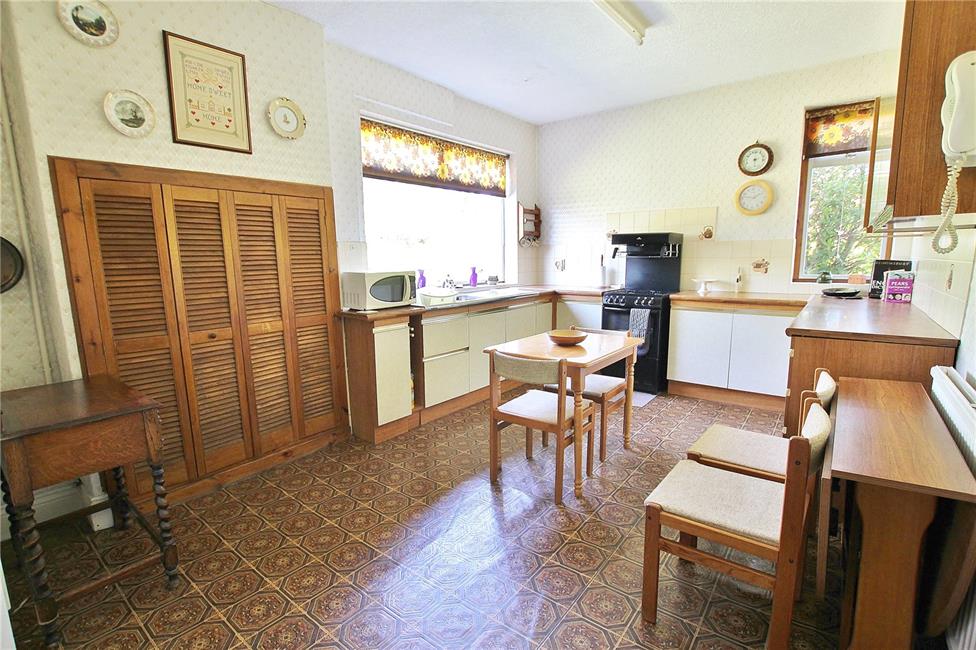 Windows to the rear and side, kitchen units appointed along three sides comprising of eye level units and base units with drawers and round nosed worktops over, ceramic wall tiling to work surface surrounds, inset sink with double drainer and mixer tap, tile effect cushion floor, double radiator, slot for cooker, louvre doors to the original fireplace now housing the Worcester gas central heating boiler timing controls, telephone point, door to large walk-in under stairs cupboard with small window to side.