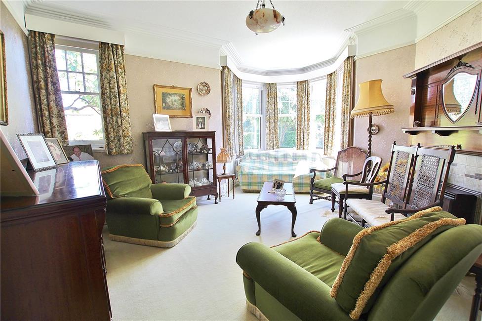 A feature lounge with a five-part turret-style window overlooking the entire front and side large garden plot with uPVC double glazed working sash windows, a shaped double radiator, a corner period fireplace with above mantle display and mirror with gas fire below within the tiled hearth (gas fire disconnected), working servants bell, period sash window to the side, original coved ceiling, picture rail and high level skirting boards.