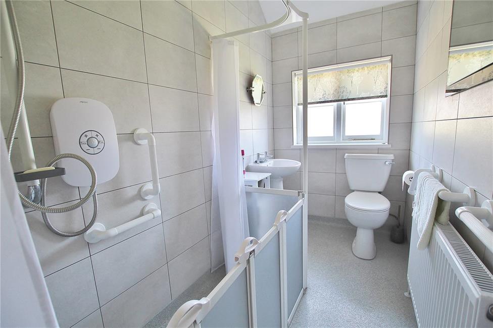 A recently refurbished suite, walk-in shower area with anti-slip floor, comprehensive ceramic wall tiling, electric shower, pedestal wash hand basin, close coupled WC, radiator.