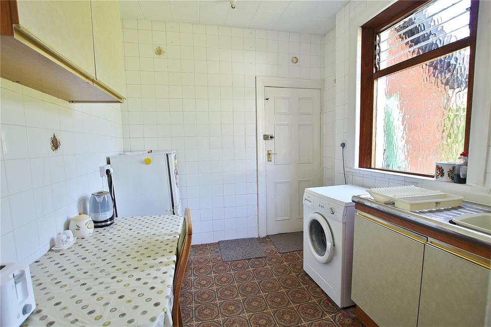 Windows to rear, base unit with inset sink and drainer, plumbing and space for washing machine, space for upright fridge/freezer, additional eye level units, ample space for breakfast table and chairs, comprehensive ceramic wall tiling, tile effect cushion flooring, door to rear lobby.