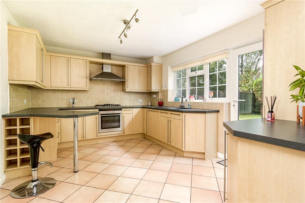 Appointed along four sides in light wood grain finished fronts with stainless steel bar handles beneath round nose worktop surfaces, inset one and a half bowl sink and drainer with mixer tap, five ring Siemens gas hob with oven below and stainless steel cooker hood, integrated fridge and freezer, integrated dishwasher, matching range of eye level units with concealed lighting, peninsular breakfast bar, quality tiled flooring, window and UPVC glazed door to the rear garden.