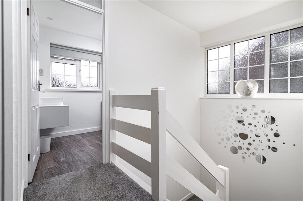 Approached via a full turning staircase with opaque window to side, access to loft, and built-in airing cupboard housing the hot water cylinder with shelving.
