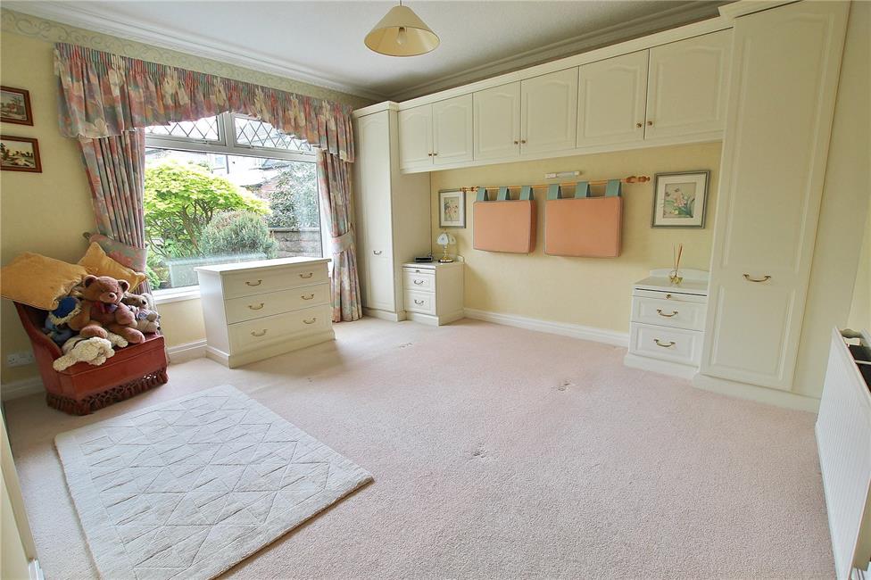 Overlooking the delightful rear garden, fitted wardrobes with mirror sliding doors, hanging rails and shelf, further fitted bedroom furniture comprising two single wardrobes, bridging unit and bedside cabinets, double radiator.