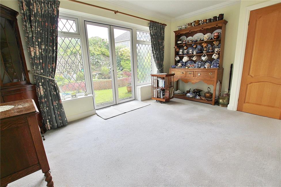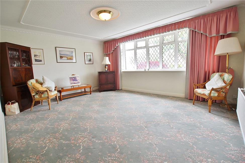 A deep shelved 7-part bow window overlooking the delightful front garden and quiet road, double radiator, decorative coved ceiling with ceiling panelling, TV points.