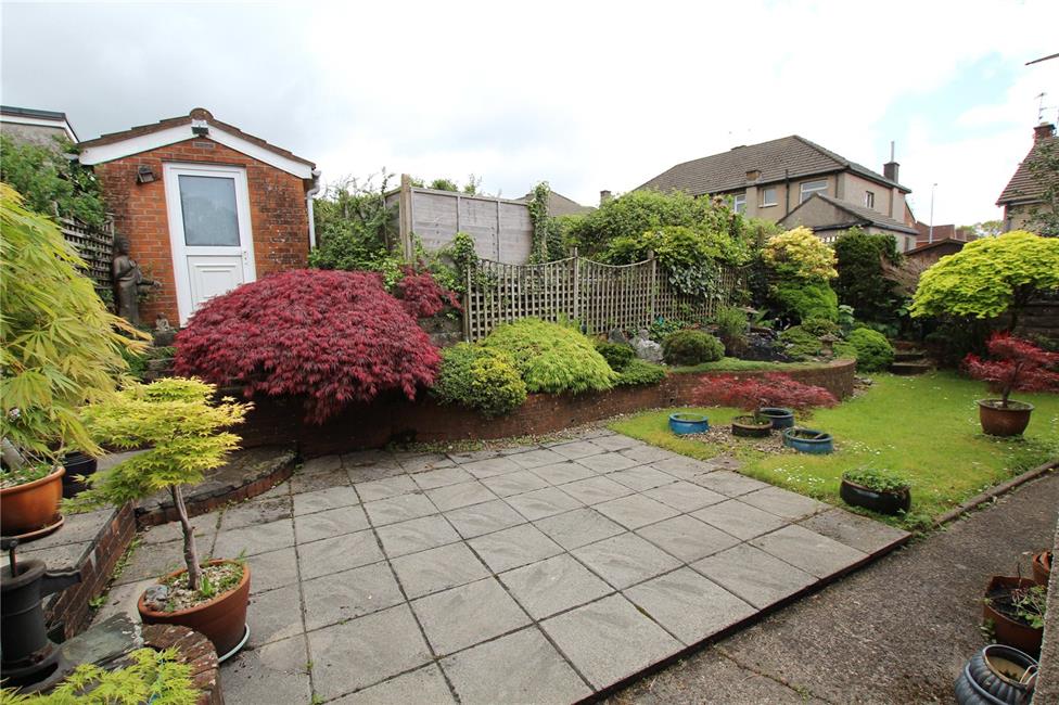 A delightfully presented manageable rear garden with a generous patio relaxation area and an area laid to lawn, shaped retaining wall with a retaining water feature and an abundance of established plants, acer trees and shrubbery, a garden storeroom, steps to a detached brick built shed, outside lighting and water tap.