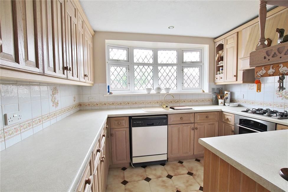 A deep shelved bow window overlooking the front, limed oak style kitchen appointed along four sides comprising of eye level units, shelving and base units with drawers and round nose worktops over, ceramic wall tiling to work surface surrounds, inset 1.5 bowl sink with mixer tap, fitted four-burner gas hob with oven below and cooker hood above, plumbing and space for a dishwasher, space for low level fridge, ceramic floor tiling, wall mounted gas central heating boiler concealed behind a matching wall unit with timing controls.